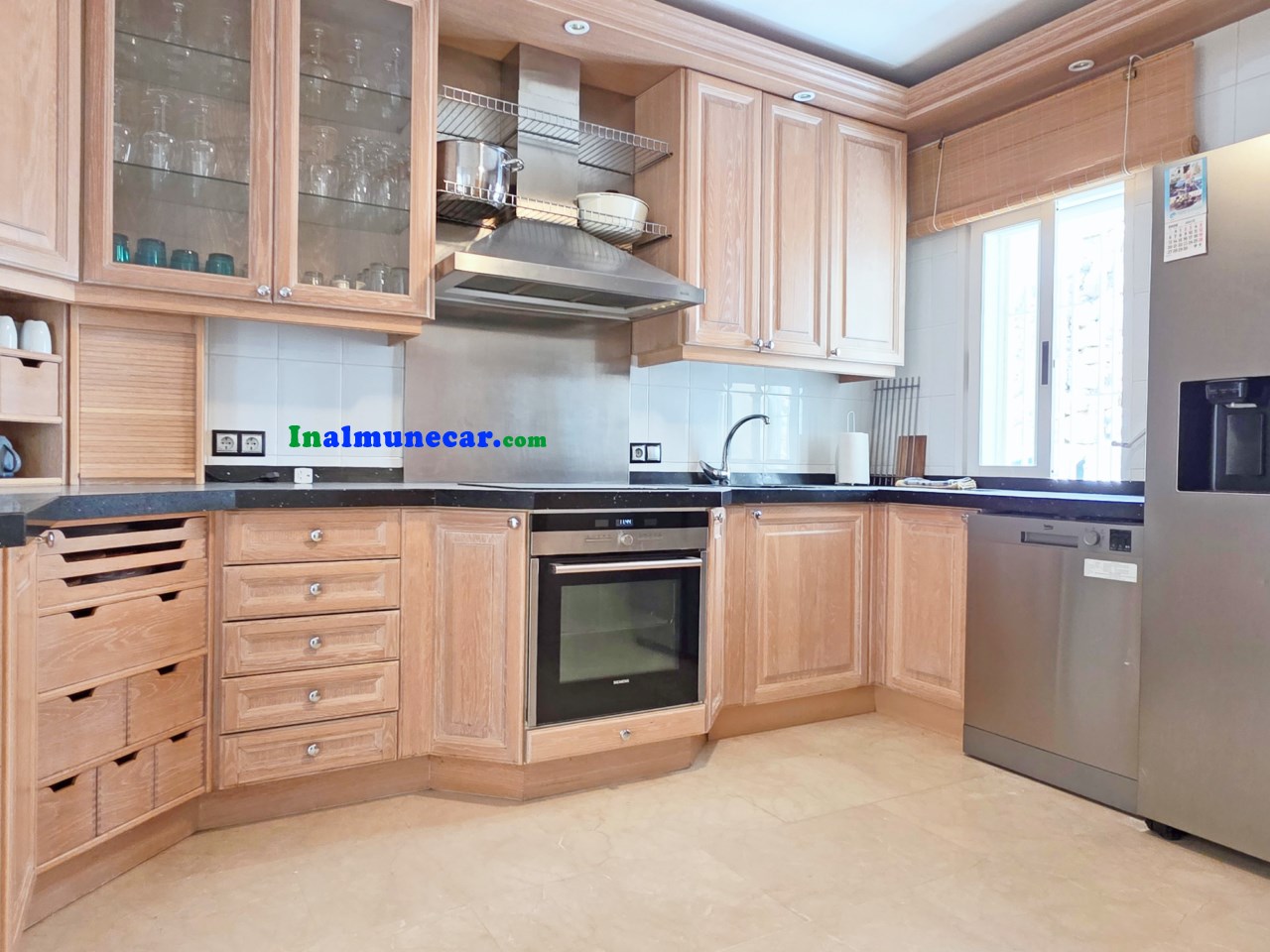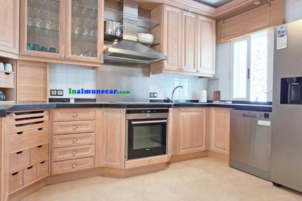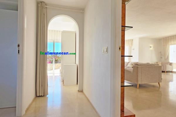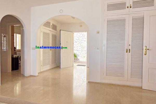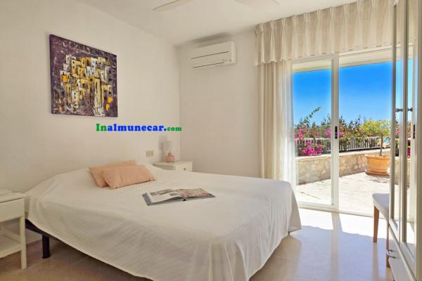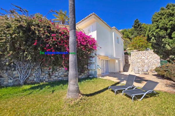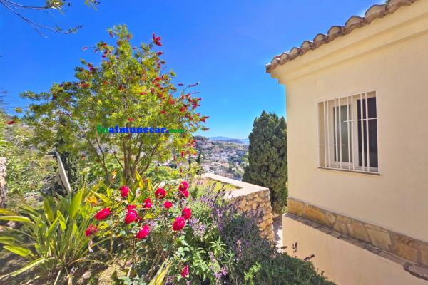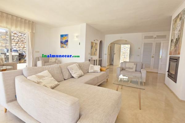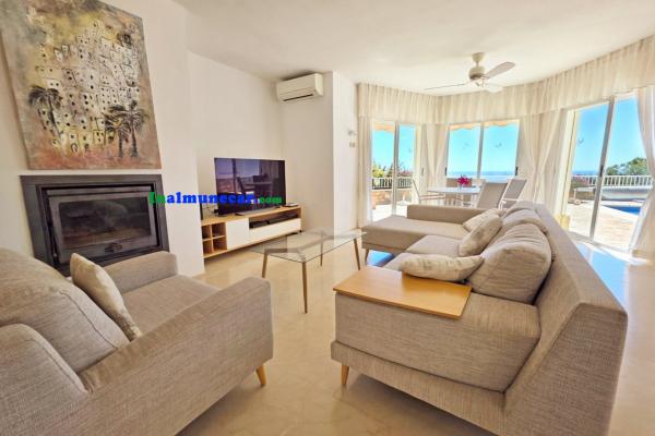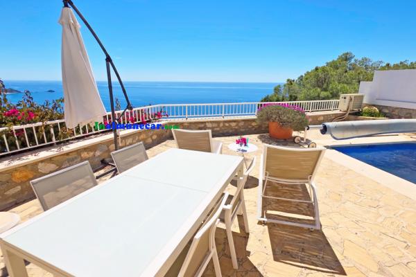 La vivienda principal, de 168 m², se encuentra completamente a nivel de una amplia terraza y la piscina, esta propiedad destaca por sus espacios amplios, luminosos y bien distribuidos. El corazón de la casa es el salón de aproximadamente 35 m², con chimenea y una puertas corredera orientada al sur que da acceso directo a la terraza perimetral y la piscina, enmarcando unas vistas espectaculares al mar y a la bahía. Junto al salón se encuentra la cocina independiente, que dispone de lavadero.